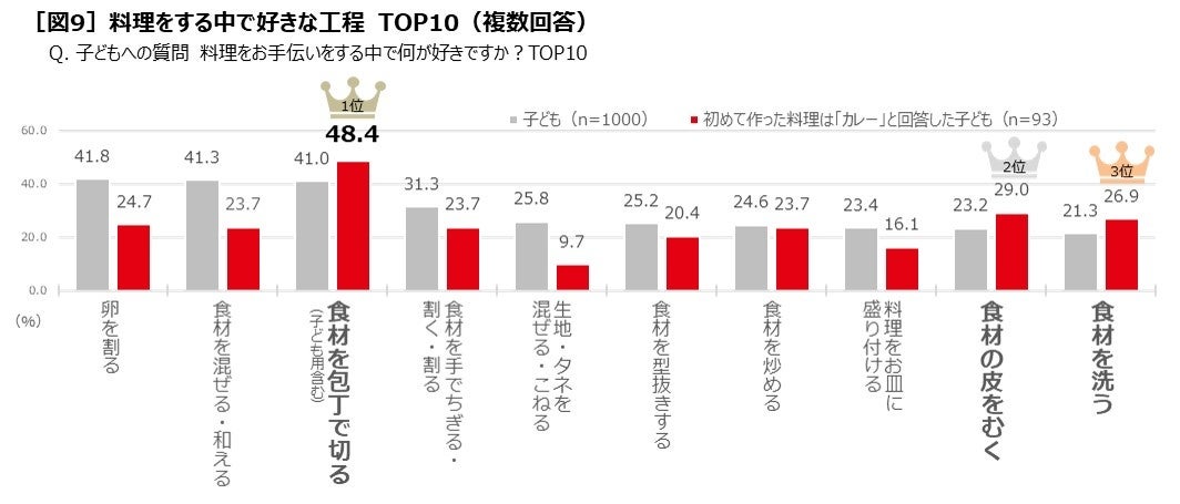料理をする中で好きな工程を子ども自身に聞くと、全体では「卵を割る」(41.8%)、「食材を混ぜる・和える」(41.3%)、「食材を包丁で切る(子ども用含む)」(41.0%)の順となりました。一方、初めて作った料理が「カレー」の子どもでは、「食材を包丁で切る(子ども用含む)」(48.4%、全体より7.4ポイント高い)と答えた子どもが最も多く、次いで「食材の皮をむく」(29.0%、全体より5.8ポイント高い)、「食材を洗う」(26.9%、全体より5.6ポイント高い)の順となりました[図9]。