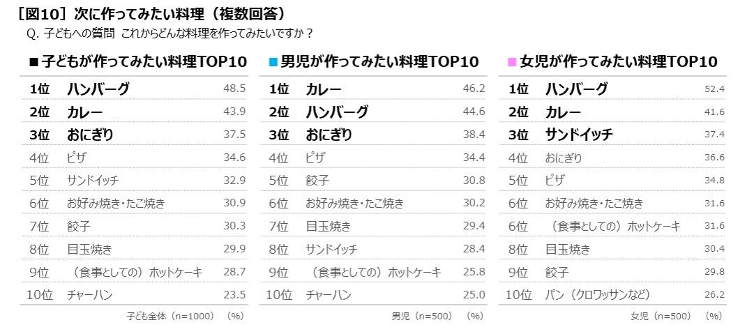 初めての料理ではさまざまなメニューに挑戦している子どもたちですが、次はどんな料理を作ってみたいか聞くと、全体では「ハンバーグ」(48.5%)、「カレー」(43.9%)、「おにぎり」(37.5%)の順となりました。性別で見ると男児では「カレー」(46.2%)、「ハンバーグ」(44.6%)、「おにぎり」(38.4%)、女児では「ハンバーグ」(52.4%)、「カレー」(41.6%)、「サンドイッチ」(37.4%)の順となり、カレーやハンバーグが男の子も女の子も作ってみたい料理として人気が高いことが分かります[図10]。
