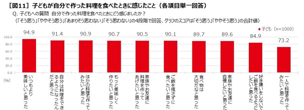 自分で作った料理を食べたときにどう感じたか、子ども自身に聞きました。すると、「いつもより美味しいと思った」(94.9%)をはじめ、「自分は料理をできるようになったんだと思った」(91.4%)、「ほかの料理も作ってみたいと思った」(90.9%)、「もっと美味しく作りたいと思った」(90.7%)、「家族やお友達に料理を作ってあげたいと思った」(90.5%)が上位に挙がりました。自分で作った料理を食べたとき、子どもの感情はポジティブな反応が多く、9割以上が料理をできるようになった!という成功体験を得ているほか、ほかの料理も作りたい、もっと美味しく作りたいという向上心も醸成しています[図11]。子どもが自分で料理を作ることは、子どもの心の成長にも大きく役立っているといえそうです。