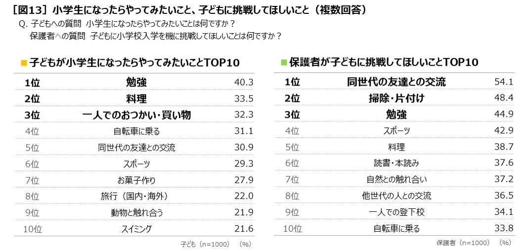 一方、子どもと同じ選択肢を保護者に提示し、子どもが小学校に入学するのを機にどのようなことに挑戦してほしいかと聞くと、「同世代の友達との交流」(54.1%)、「掃除・片付け」(48.4%)、「勉強」(44.9%)、「スポーツ」(42.9%)、「料理」(38.7%)の順となりました。多くの保護者が「友達との交流」「掃除・片付け」を望んでおり、また保護者の約4割が「料理」に挑戦してほしいと願っています[図13]。