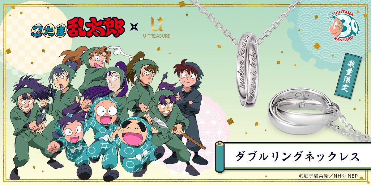 大人のための本格的なキャラクタージュエリーを扱うユートレジャー(東京都豊島区:代表取締役:伊藤 崇史)は『忍たま乱太郎』の「忍たま30ベストコンビ投票」にて投票で選ばれた組み合わせをはじめ、学園生の絆を表現したダブルリングネックレス全6種類を1月12日(木)~2月7日(火)の期間限定で予約受付を行います。このたびの新作は、リングの表面に2人の名前を英文で刻印し、内側にはイメージアイコンをあしらったデザインのネックレスです。ユートレジャーコンセプトストア池袋、ユートレジャーオンラインショップにて取り扱います。