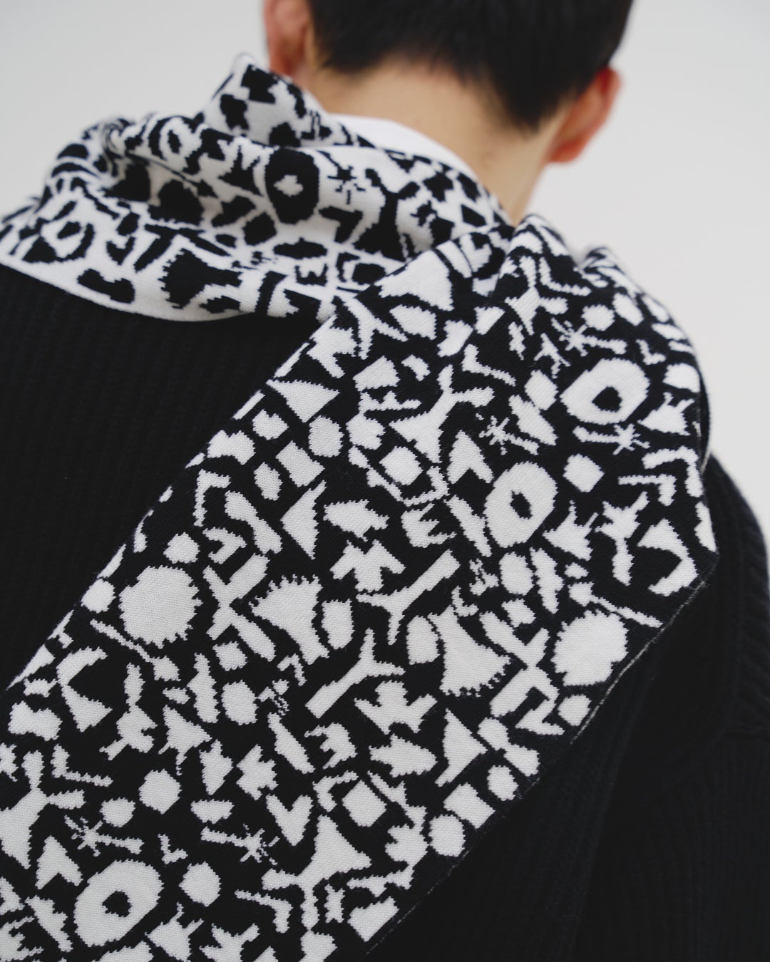 黒と白のコントラストが魅力のアートを表現するために、袋ジャカードという技法を選択しました。表面から見ても裏面から見てもアートが再現されているのが特徴です。