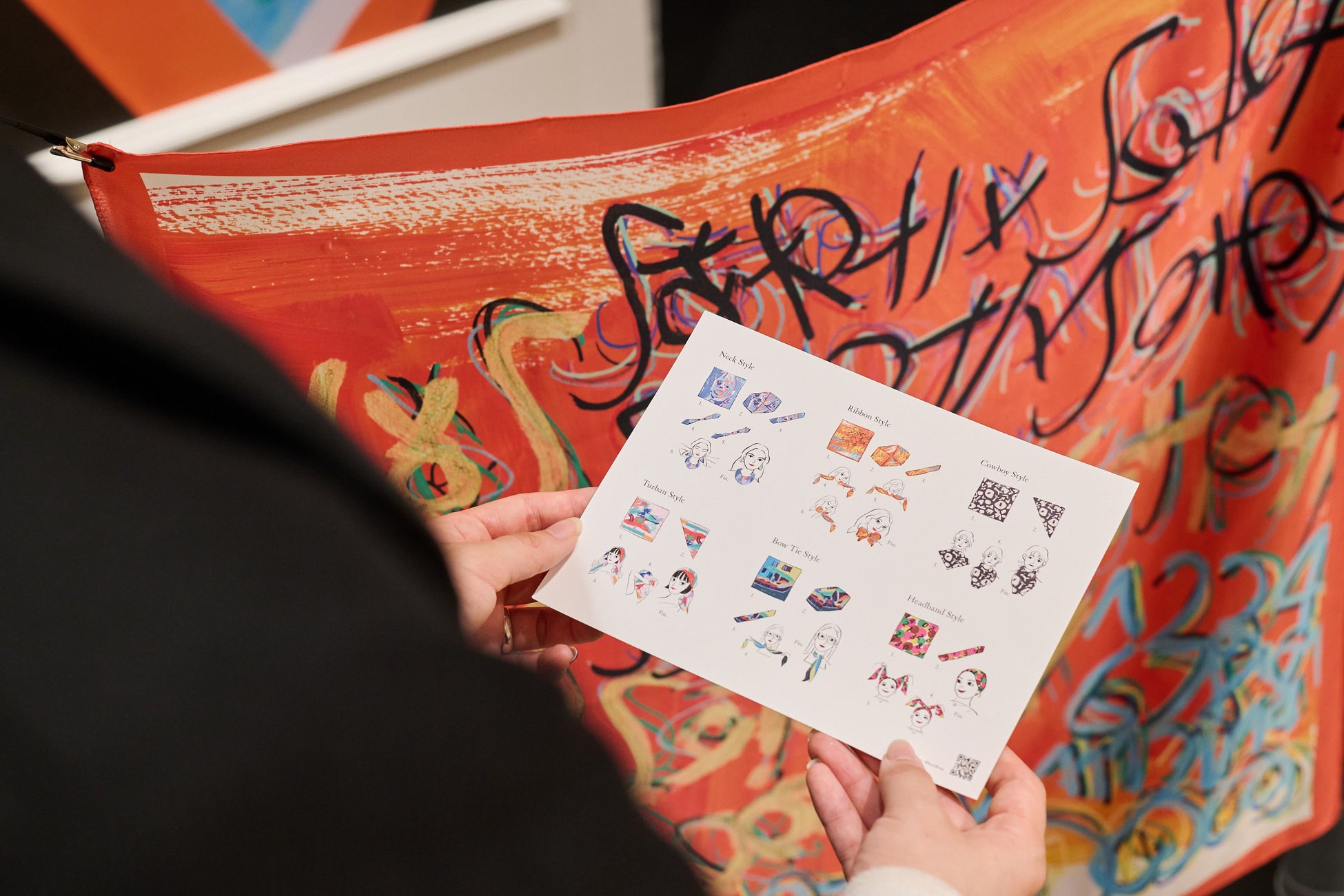 作品のエネルギーをそのままに再現したアートスカーフを店頭で手に取ってご覧いただけます。ご購入・ご予約いただいた方には特典として、スカーフスタイリングをイラストで表現したオリジナルポストカードをプレゼントいたします。また、スカーフをより自由に楽しめる「スカーフループ付きベーシックシャツ」や「スカーフコンビバッグ」などの関連アイテムも登場。