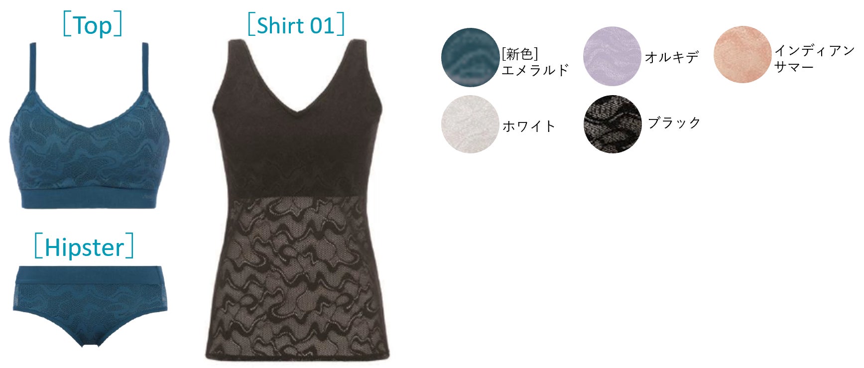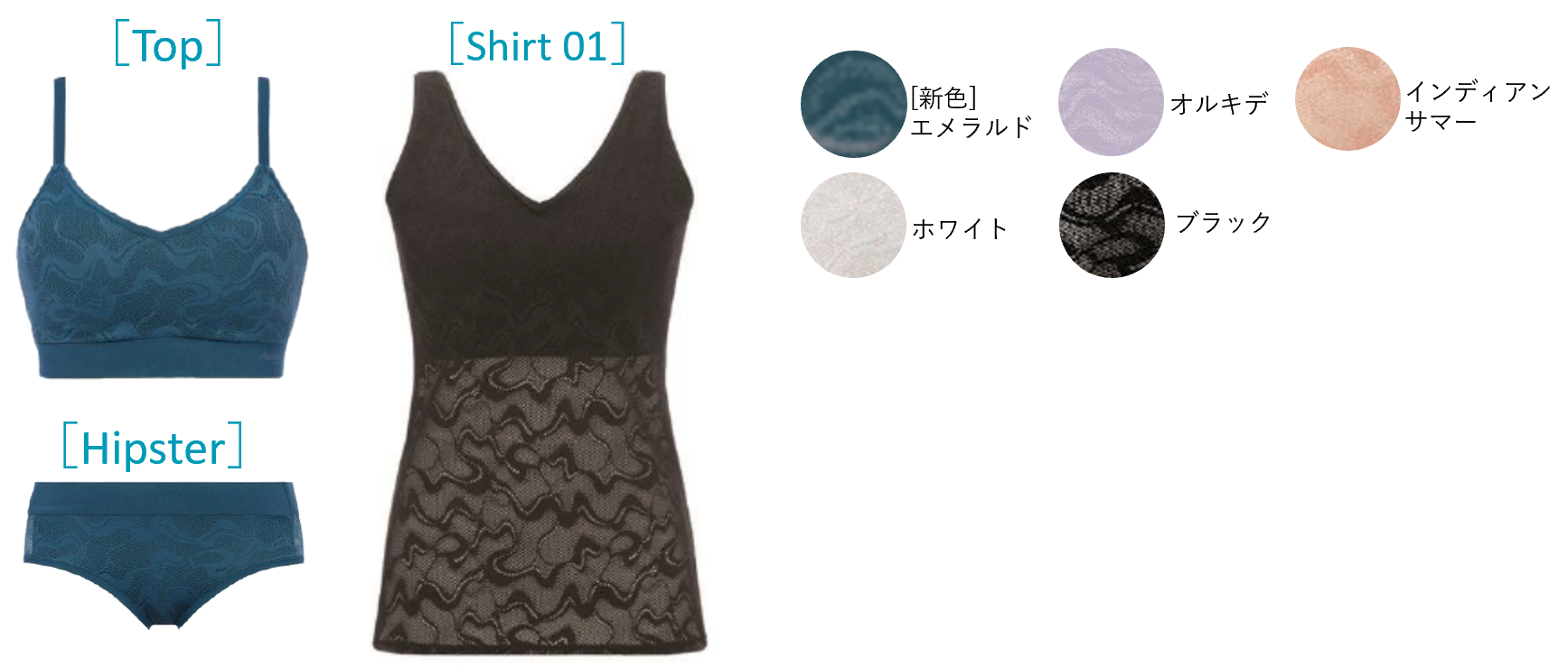 GO Allroundシリーズならではの快適さにフェミニンさが漂うレースデザインです。[Top][Top Large] と [Shirt 01] [Shirt 01 Large]のアンダーバスト部分や[Hipster]のウエスト部分には、肌ざわりのなめらかなレーヨン素材を使用。