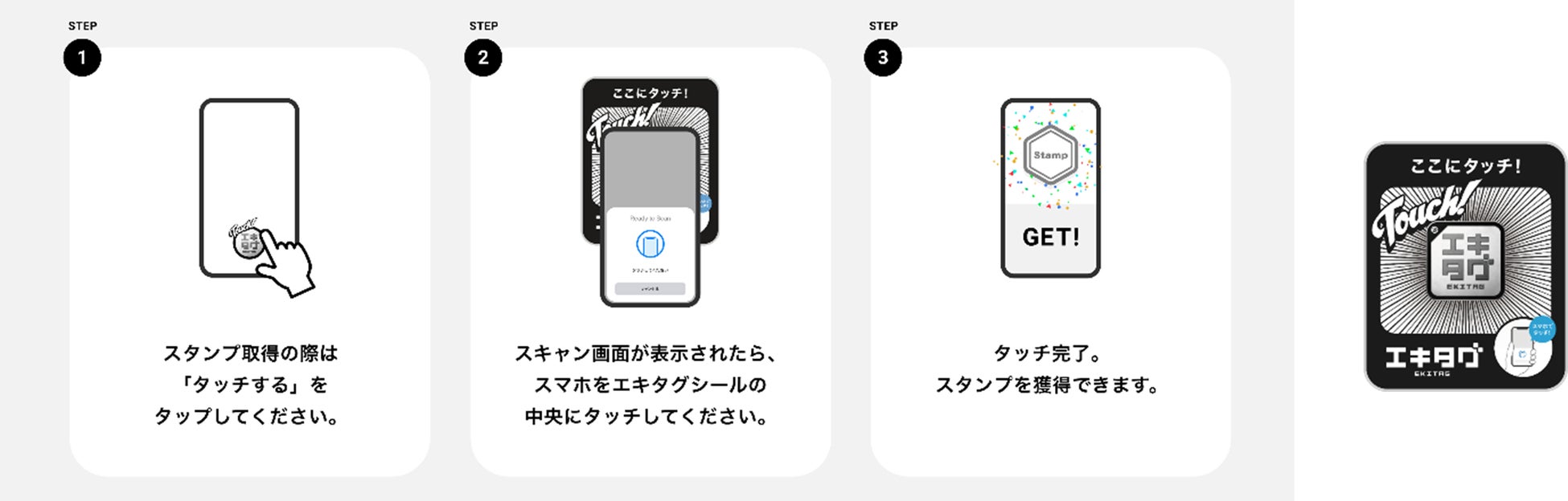 駅などに設置されたNFCタグをスマートフォンで読み込むことで、設置された場所のスタンプをアプリ内のデジタルスタンプ帳で収集することができるアプリサービス。