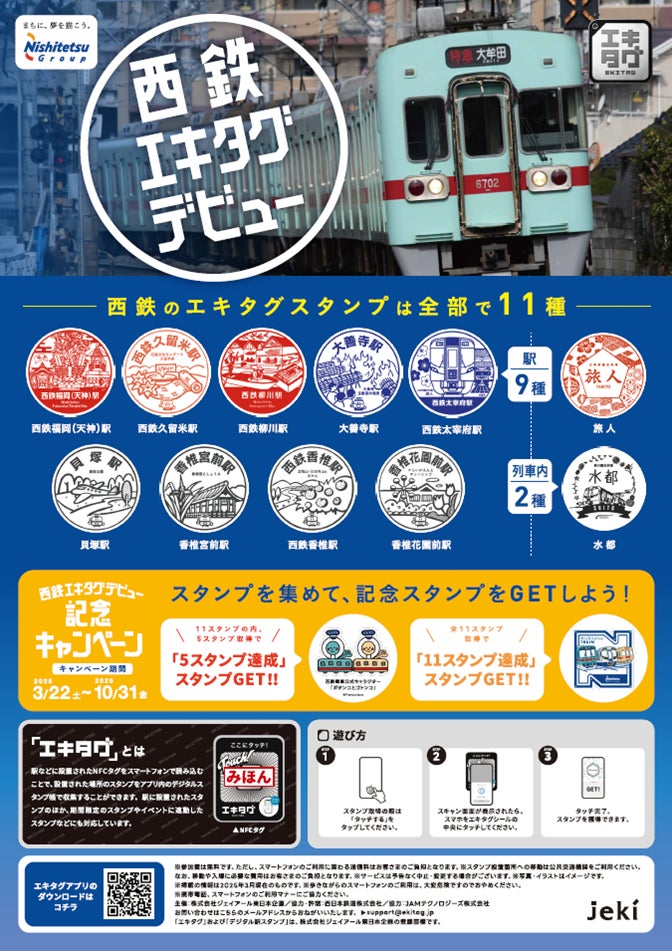 ・西日本鉄道㈱は、㈱ジェイアール東日本企画(東京都渋谷区 代表取締役社長:赤石 良治)が運営する駅スタンプアプリ「エキタグ」に参画し、2025年3月22日(土)より天神大牟田線お よび貝塚線の一部駅でデジタルスタンプの提供を開始いたします。