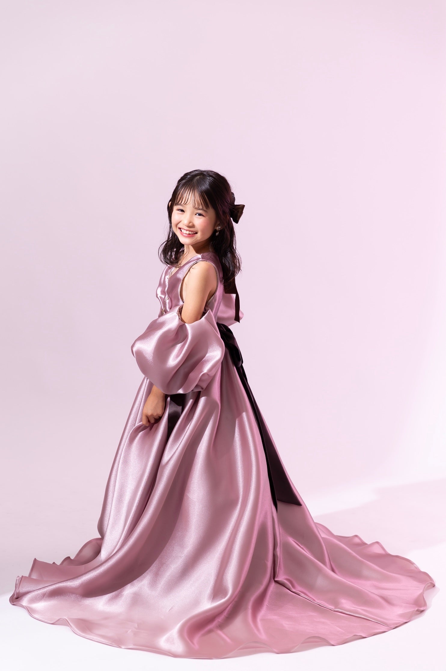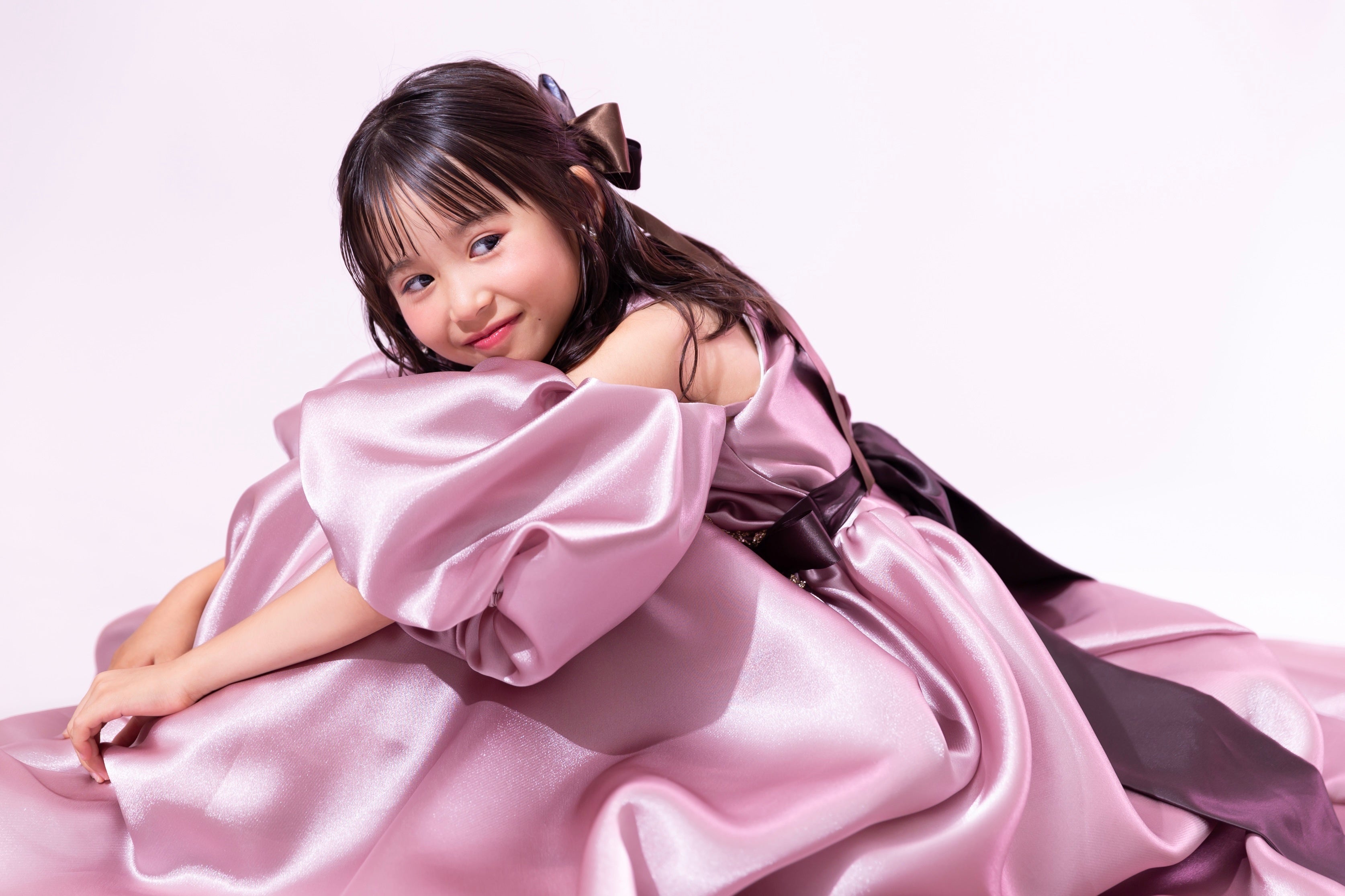 ウェストマークのリボンと同色の大ぶりのリボンをヘッドアクセを主役に、キラっとさりげなく揺れるイヤリングをポイントにして大人っぽさの中にキッズの可愛らしさを引き出すスタイルをご提案いたします。
