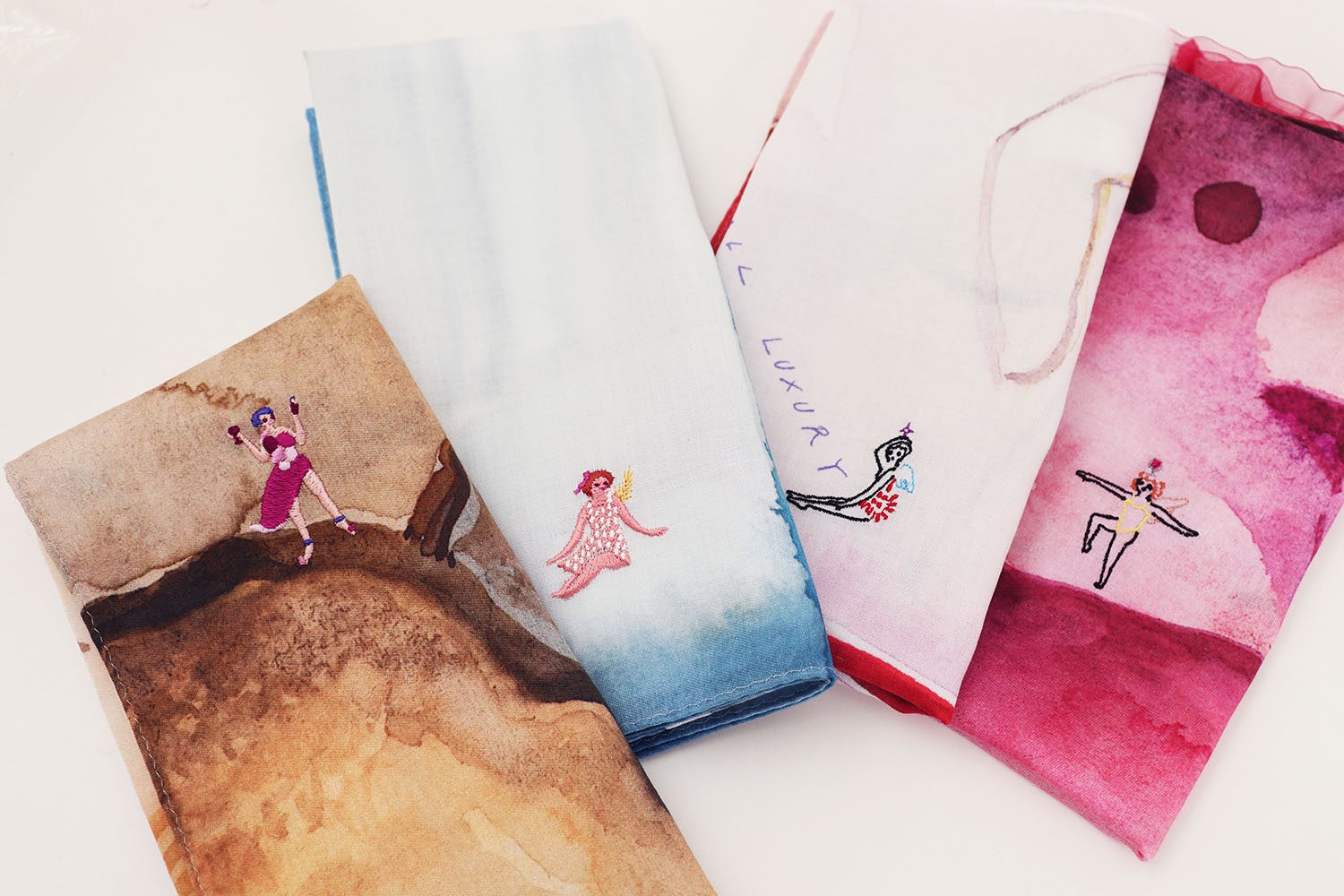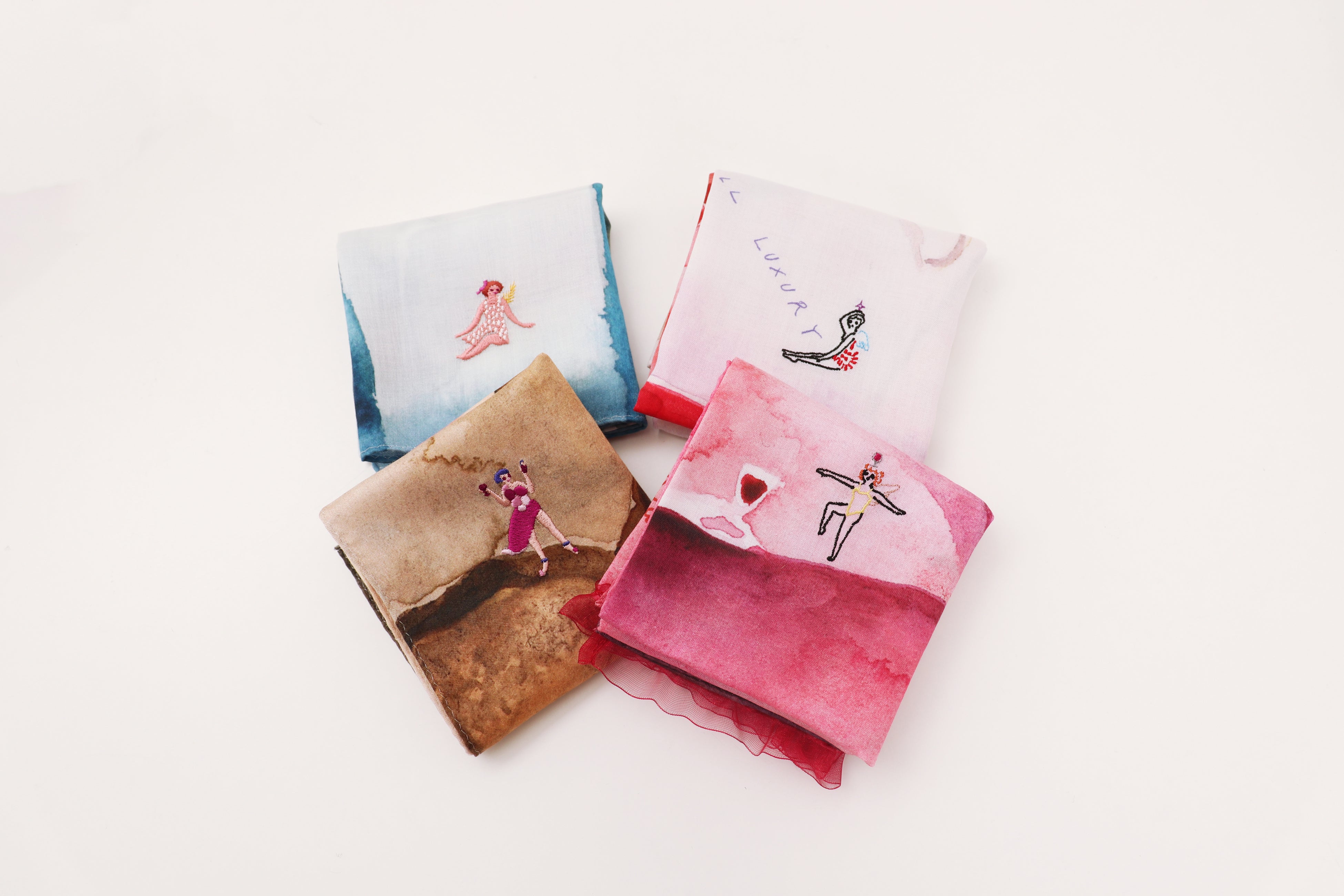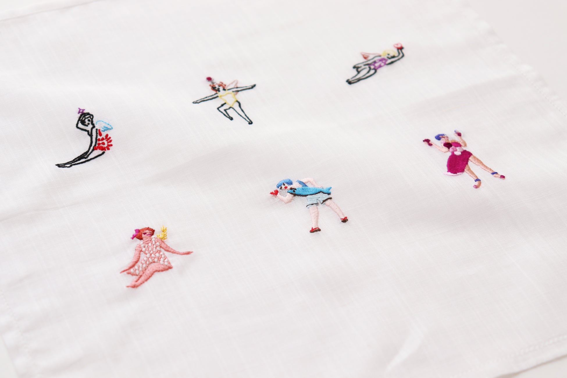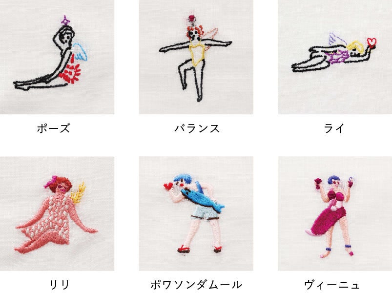 新作ハンカチーフ4柄の発売に合わせて、「お米の妖精」「赤ワインの妖精」「魚の妖精」など、田中麻記子さんがデザインしたオリジナル刺繍全6柄を展開いたします。新作ハンカチーフはもちろん、店内で展開しているお好きなハンカチーフにも、お好みの位置に刺繍を施すことができます。まるでオリジナルストーリーを描くように、ハンカチーフと妖精が織りなす一枚をお楽しみください。