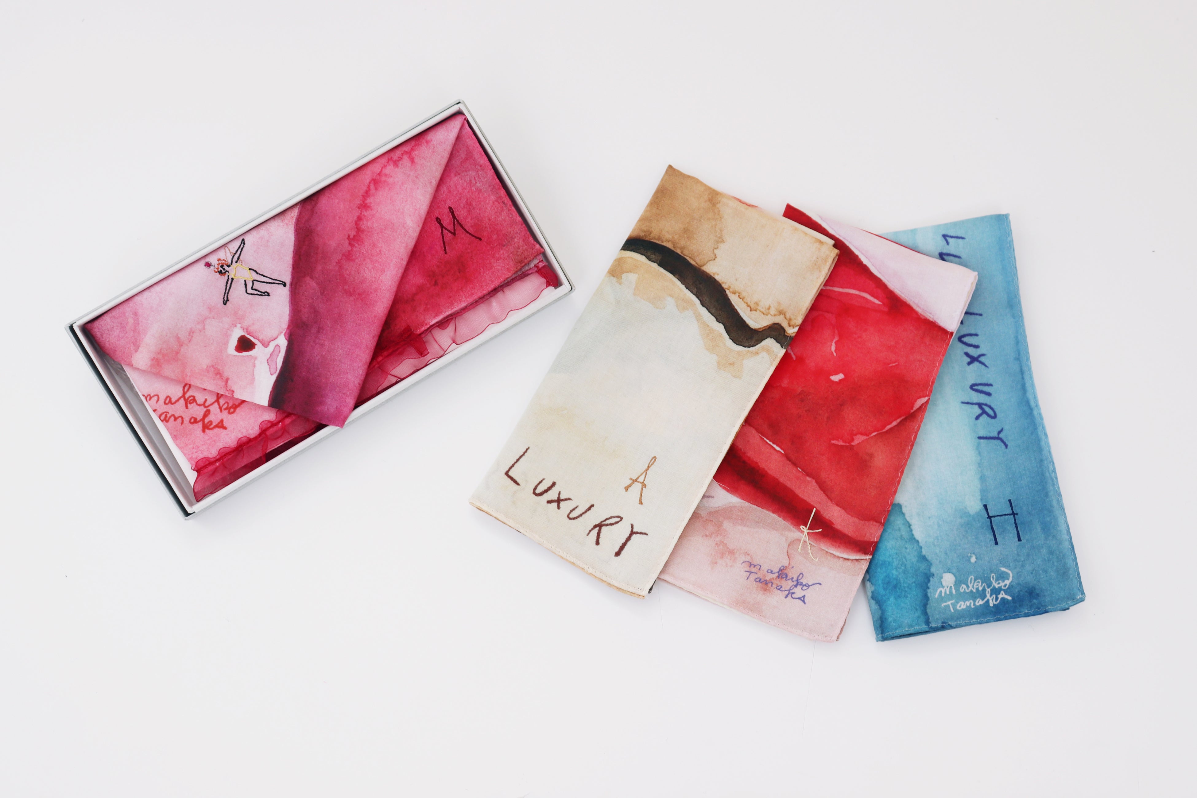 ※オンラインショップでは、田中麻記子さんの新作ハンカチーフ「Maguro(マグロ)」「Saké(サケ)」「Truffe(トリュフ)」「Vin Rouge(ヴァン・ルージュ)」の4柄が対象となります。なお、刺繍位置はおすすめの固定位置でのご案内となります。