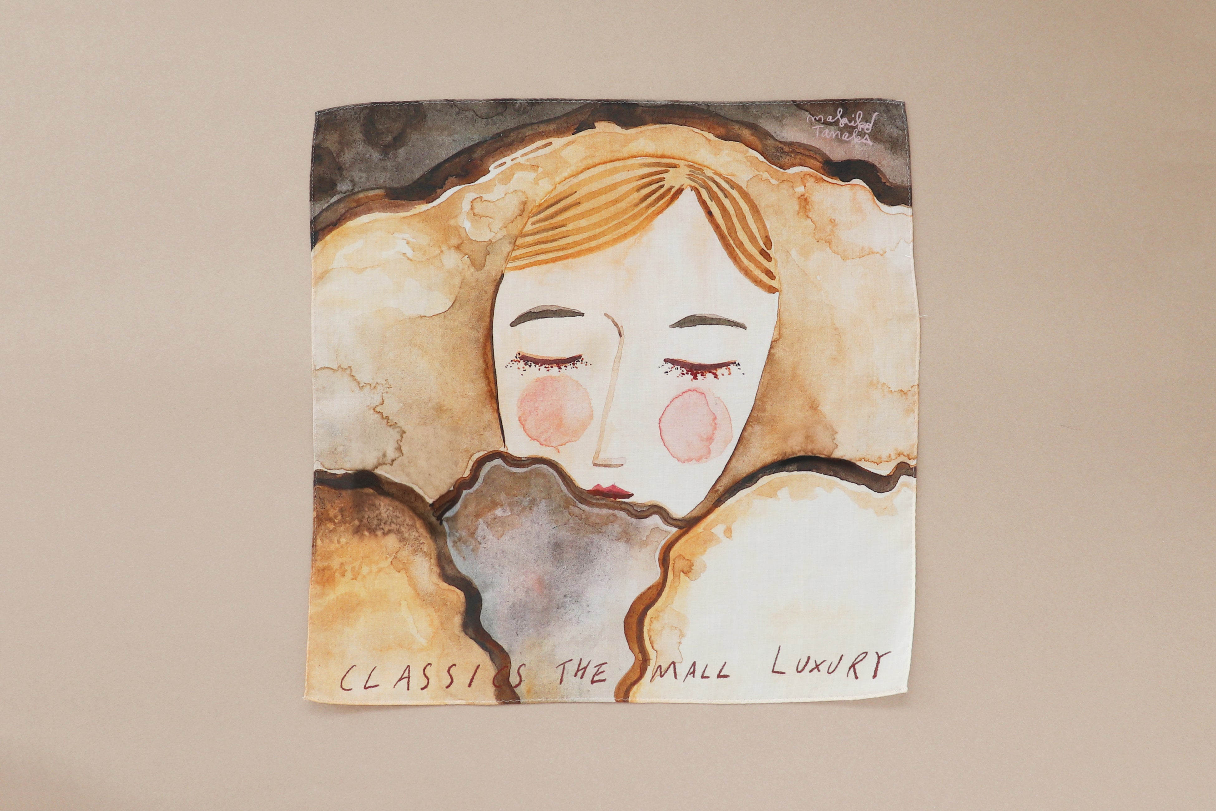 原画の魅力を最大限に生かすプリント技法で、ハンカチーフに仕立てました。落ち着いた大人の色合いの中に、田中さんならではのユーモアと可愛らしさが組み合わさった、広げて楽しい一枚です。