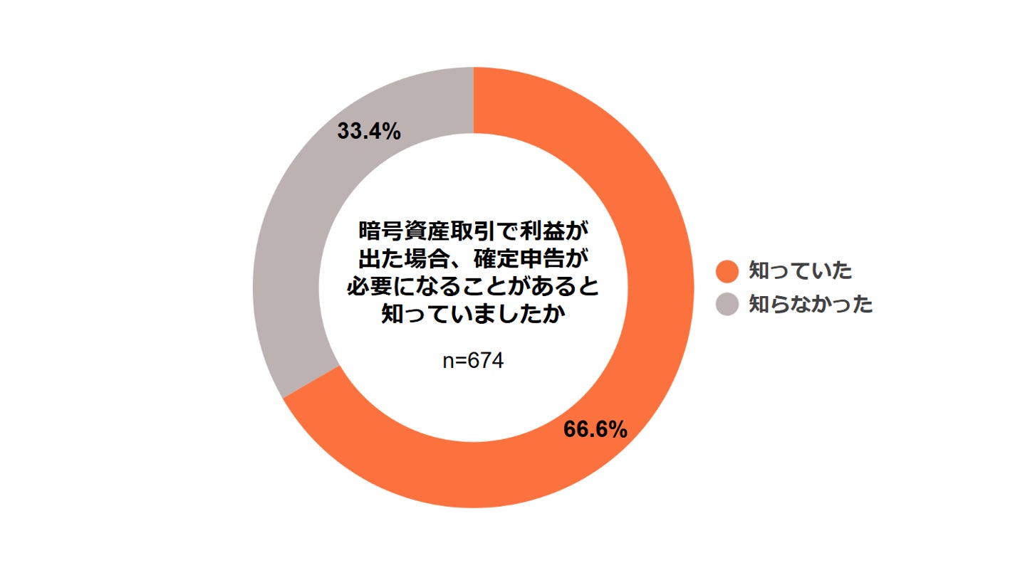 暗号資産取引で一定の利益が出た場合、確定申告が必要となることを知っていたかを尋ねたところ、「知っていた」が66.6%で、「知らなかった」(33.4%)を上回りました。