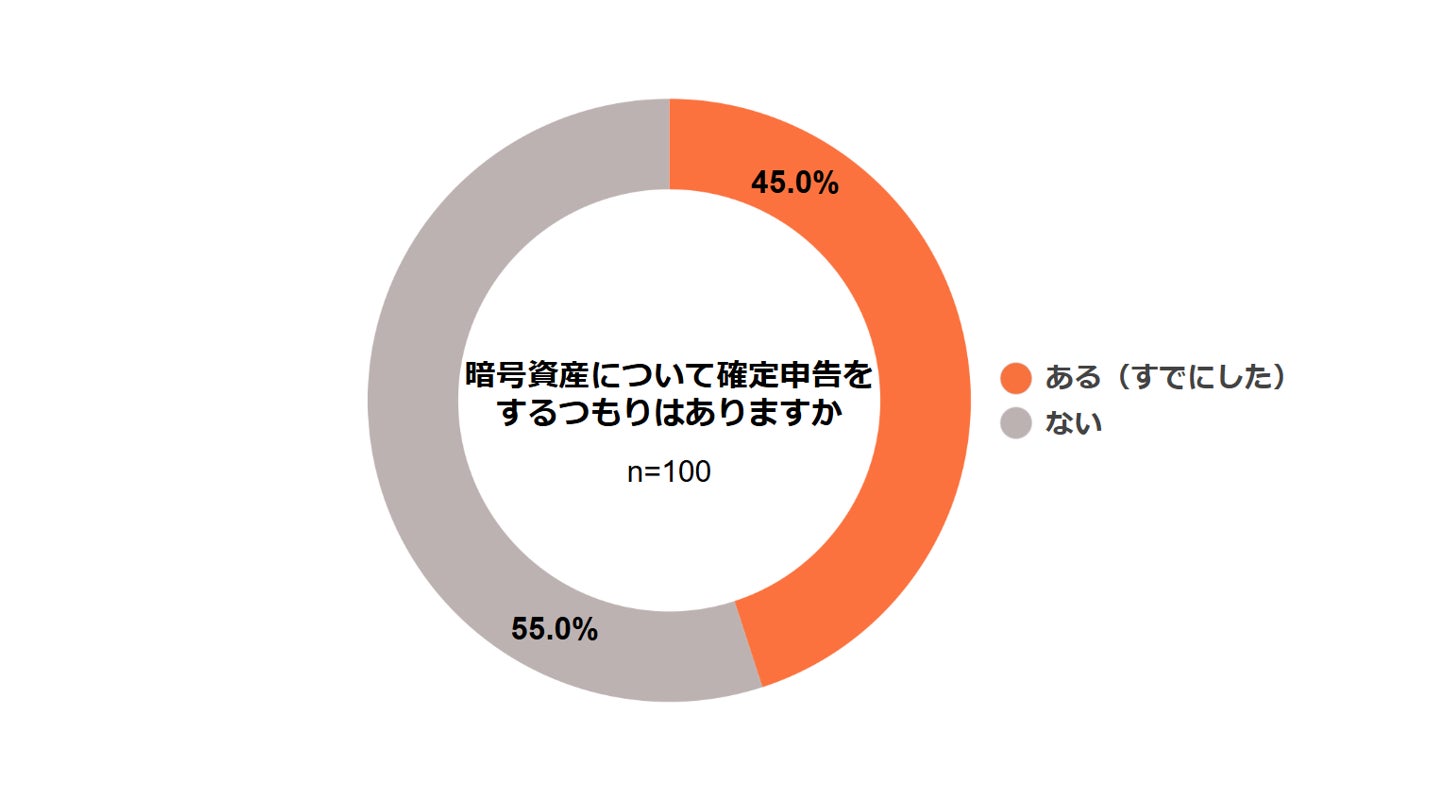 暗号資産について確定申告をするつもりがあるかを尋ねたところ、「ある(すでにした)」が45.0%、「ない」が55.0%という回答でした。