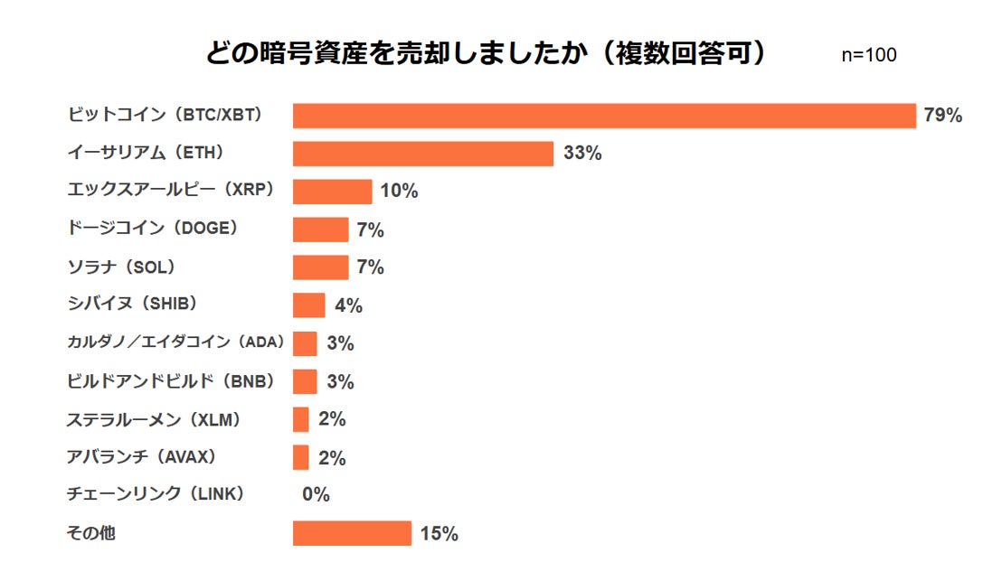 売却した暗号資産の銘柄を尋ねたところ、「ビットコイン(BTC/XBT)」が79%で最多でした。「イーサリアム(ETH)」が33%、「エックスアールビー(XRP)」が10%と続きました。