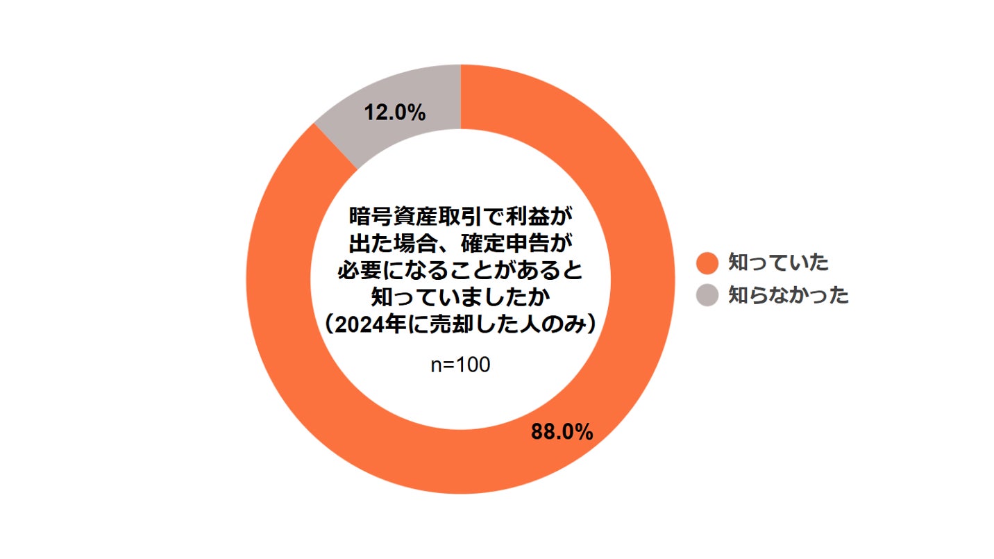 2024年に暗号資産を売却したと回答した人(全体の14.8%、100人)に限った場合は、「知っていた」が88.0%で、「知らなかった」が12.0%でした。暗号資産を売却していない人に比べ、確定申告を意識している割合が高い結果となりましたが、実際に売却したにもかかわらず、「知らなかった」という人が一定数いるという結果になりました。