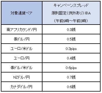 ※キャンペーンスプレッドの提示時間帯はすべて対象期間中の各営業日の午前9時~翌午前3時。同期間中の通常スプレッドは各営業日の午前3時~午前9時に提示。