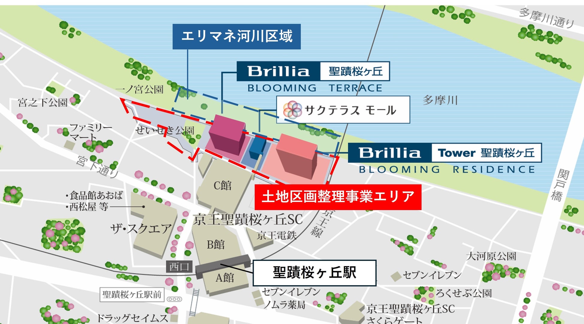 東京都多摩市の聖蹟桜ヶ丘北地区は、百貨店等の生活利便施設が集積する京王線「聖蹟桜ヶ丘」駅至近に位置し、多摩川沿いの豊かな自然も感じられるエリアです。一方、これまで、こうした地域の特徴が十分に利活用されていなかったことに加え、近年の災害激甚化を受けて、水害対策をはじめとした防災力向上が喫緊の課題となっていました。本取り組みは、気候変動自体を脱炭素社会の実現に向けた「機会」と捉え、土地区画整理事業・住商複合開発・エリアマネジメントそれぞれの取り組みによる課題解決を実現したものです。複数の事業主体(東京建物、東栄住宅、京王電鉄、伊藤忠都市開発、聖蹟桜ヶ丘エリマネ)が参画し、それぞれのノウハウを結集することで、分譲マンション開発敷地と隣接する河川区域を一体的に捉え、高規格堤防の基準に準拠した宅盤の整備や分譲マンションのZEH化をはじめとする、先進技術を随所に導入しました。