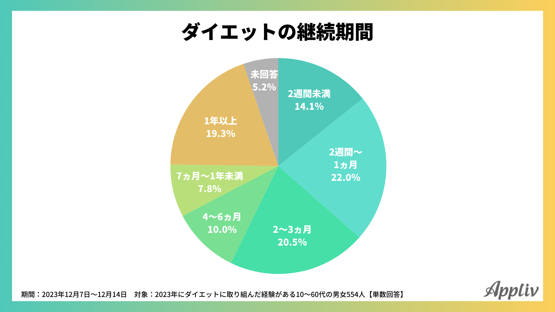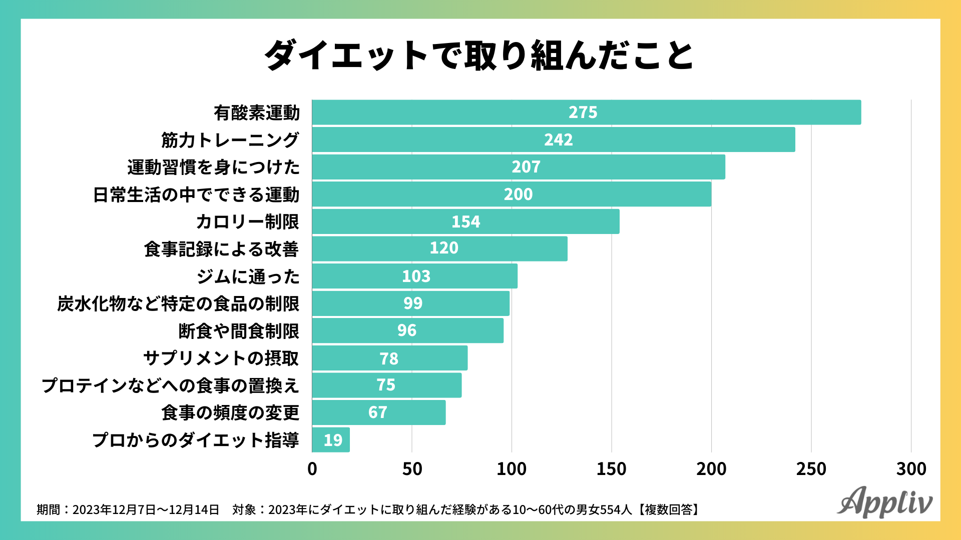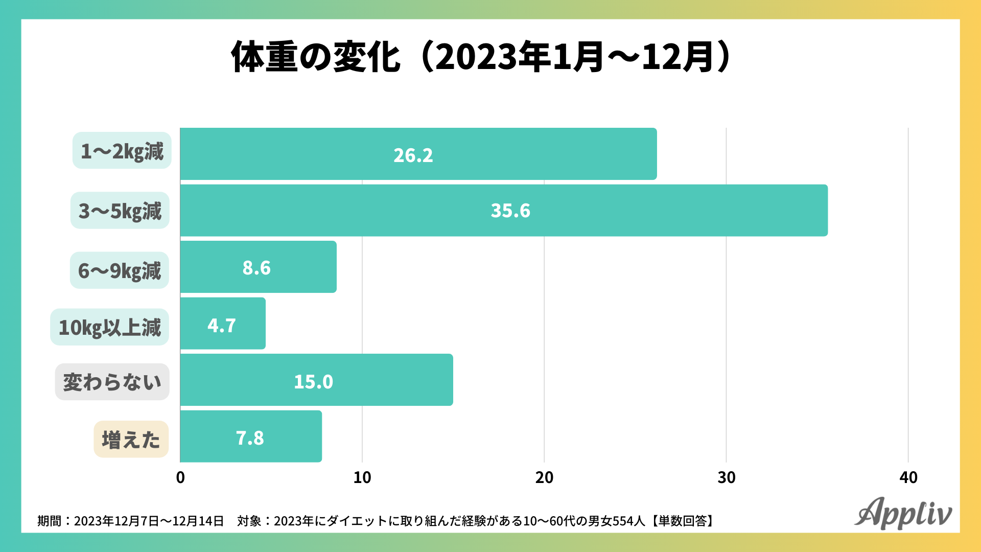 Appliv編集部では、2023年ダイエットに取り組んだ10~60代男女554人を対象に、ダイエットに関するアンケート調査を行いました。ダイエットを始めた理由や取り組んだ期間、取り組んだ内容、体重の変化、利用したダイエットアプリなどについて、調査の結果を公開します。