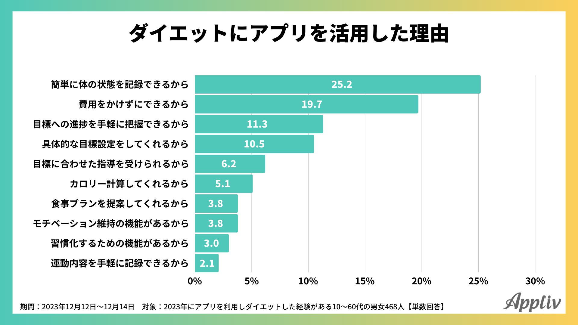 ダイエットにアプリを活用した468人にその理由を聞いてみたところ、最も回答が多かったのは「簡単に体の状態を記録できるから(25.2%)」次いで「費用をかけずにできるから(19.7%)」、「目標への進捗を手軽に把握できるから(11.3%)」でした。