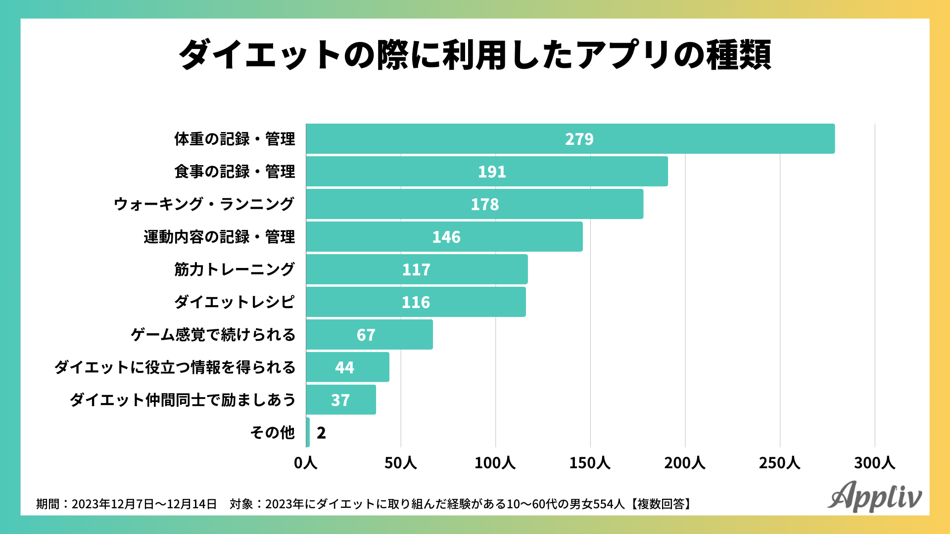ダイエットの際に利用したアプリについて調べてみると、アプリを使用した人は554人中468人でした。1位は「体重の記録・管理(279人)」、2位「食事の記録・管理(191人)」、3位「ウォーキング・ランニング(178人)」でした。