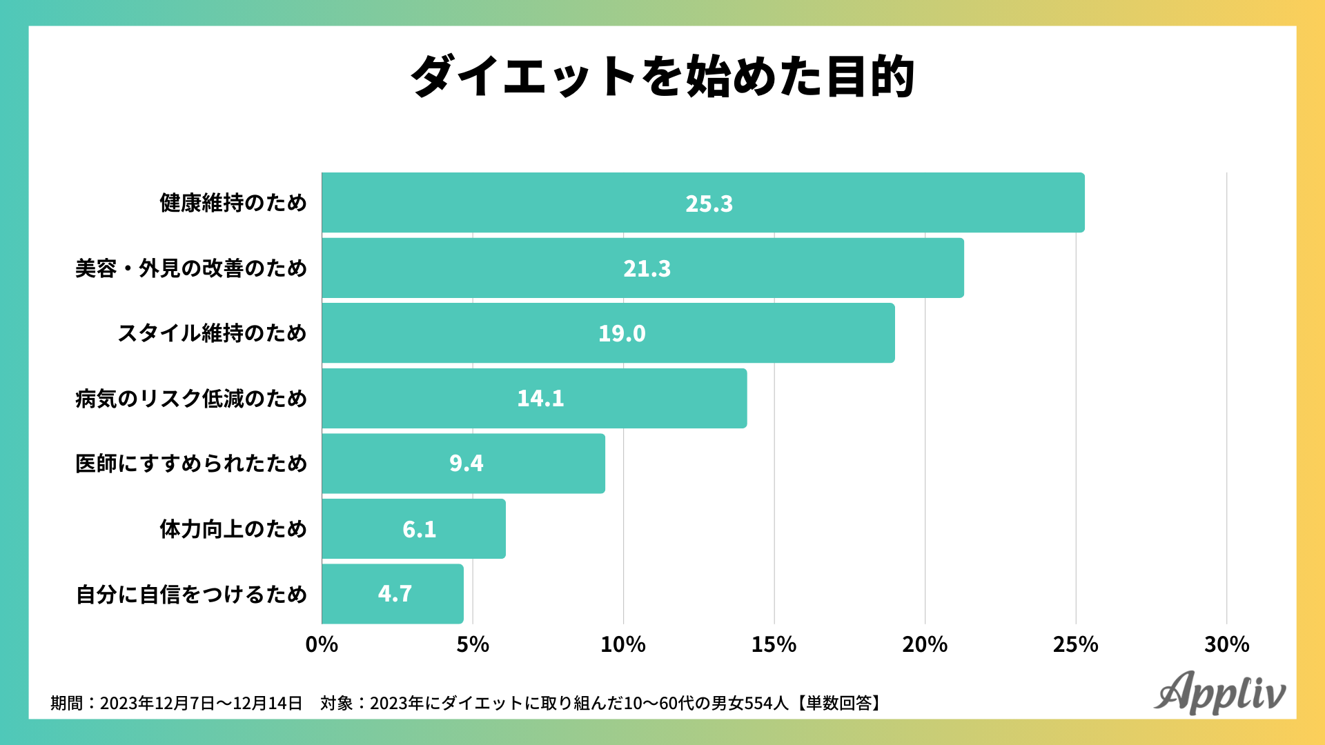 2023年の1年間にダイエットに取り組んだことがある554人に目的を聞いたところ、最も多かったのは「健康維持のため(25.3%)」、次いで「美容・外見の改善のため(21.3%)」、「スタイル維持のため(19.0%)」でした。