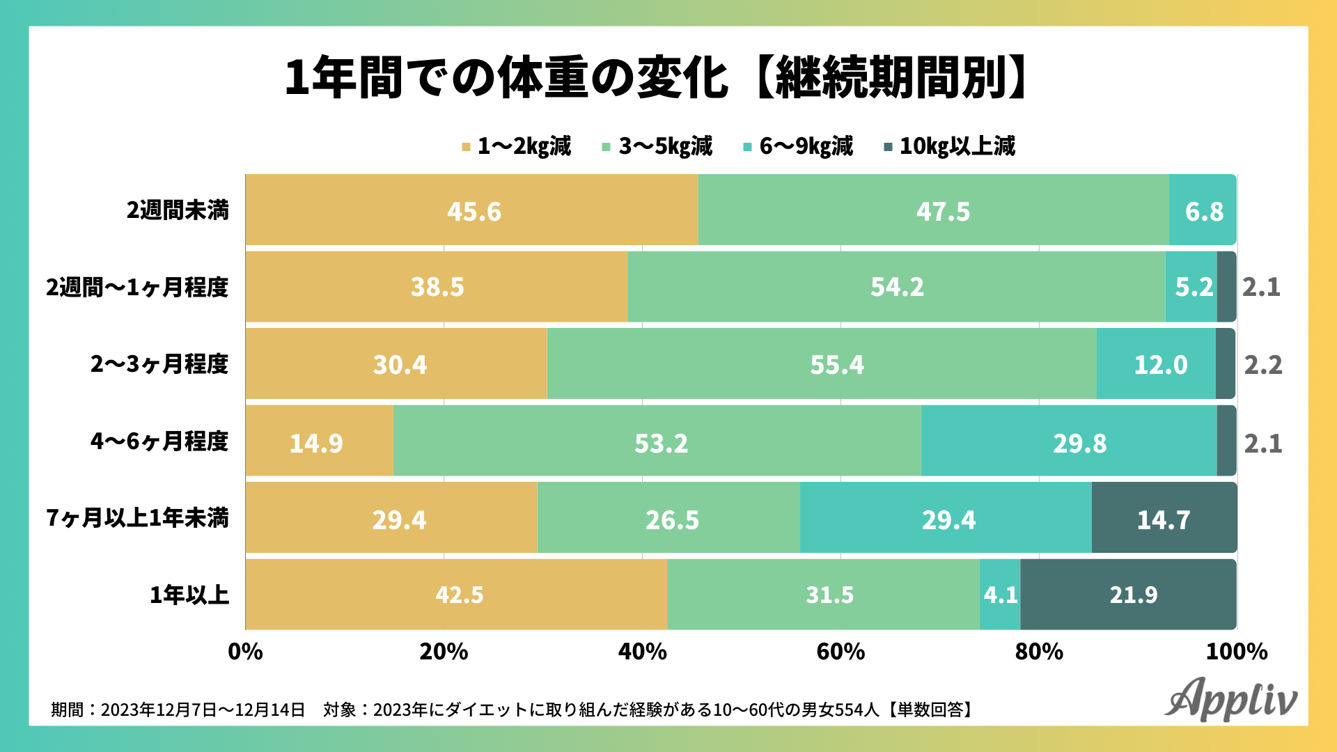 10kg以上体重が減少した人の割合は、ダイエット継続期間が半年以下では2%前後なのに対し、7~12ヶ月では14.7%、1年以上では21.9%でした。