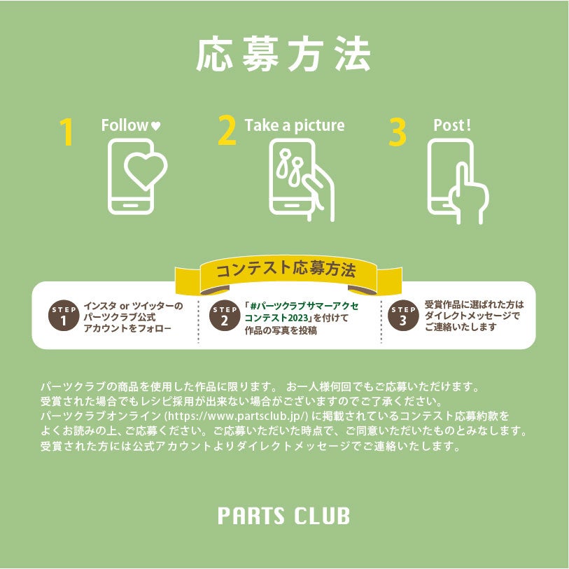 パーツクラブのパーツを使った作品を、【 #パーツクラブレサマーアクセコンテスト2023 】を付けて、InstagramまたはTwitterへ投稿するだけ!