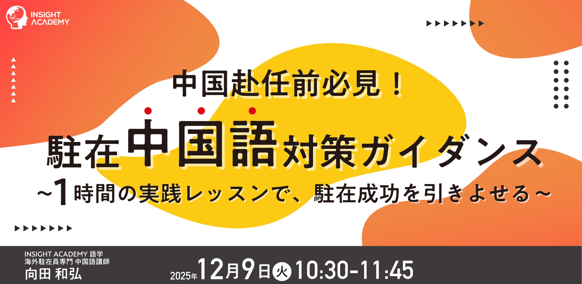 グローバル⼈材育成・研修業を⼿掛けるインサイトアカデミー株式会社(本社:東京都港区新橋、代表:金 珍燮)は、無料webセミナー「【中国赴任前必見!】”駐在中国語” 対策ガイダンス~1時間の実践レッスンで、駐在成功を引きよせる~」を開催致します。