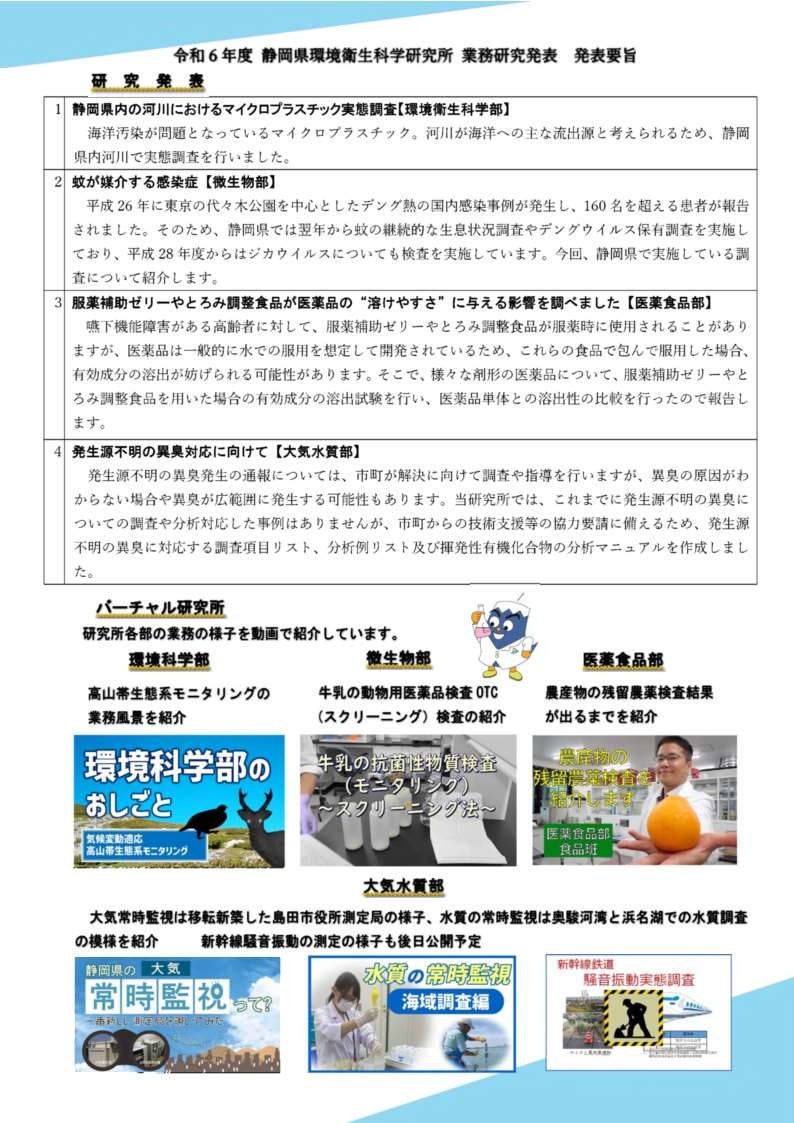 大気、水質、食品、医薬品、微生物等の各分野の研究成果の発表に加え、業務の内容を動画で紹介する「バーチャル研究所」も設け、普段は見ることのできない研究所の仕事の様子を紹介しています。