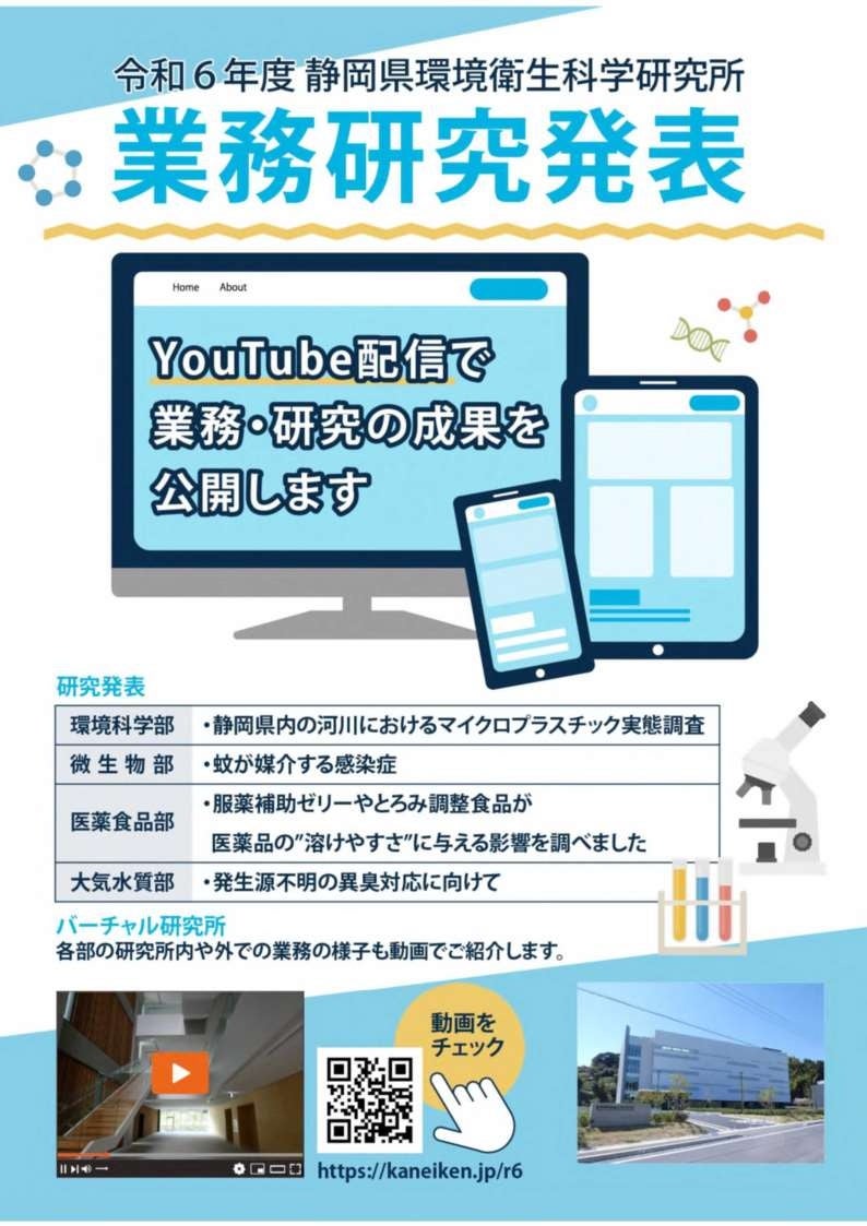 静岡県環境衛生科学研究所では、大気、水質、食品、医薬品、微生物等の各分野の研究成果を広く皆様に知っていただくため、例年「業務研究発表会」を開催しています。今年度は会場開催からYouTubeによる動画配信に変更し、いつでも好きな時間にパソコンやスマホで視聴できるようにしました。