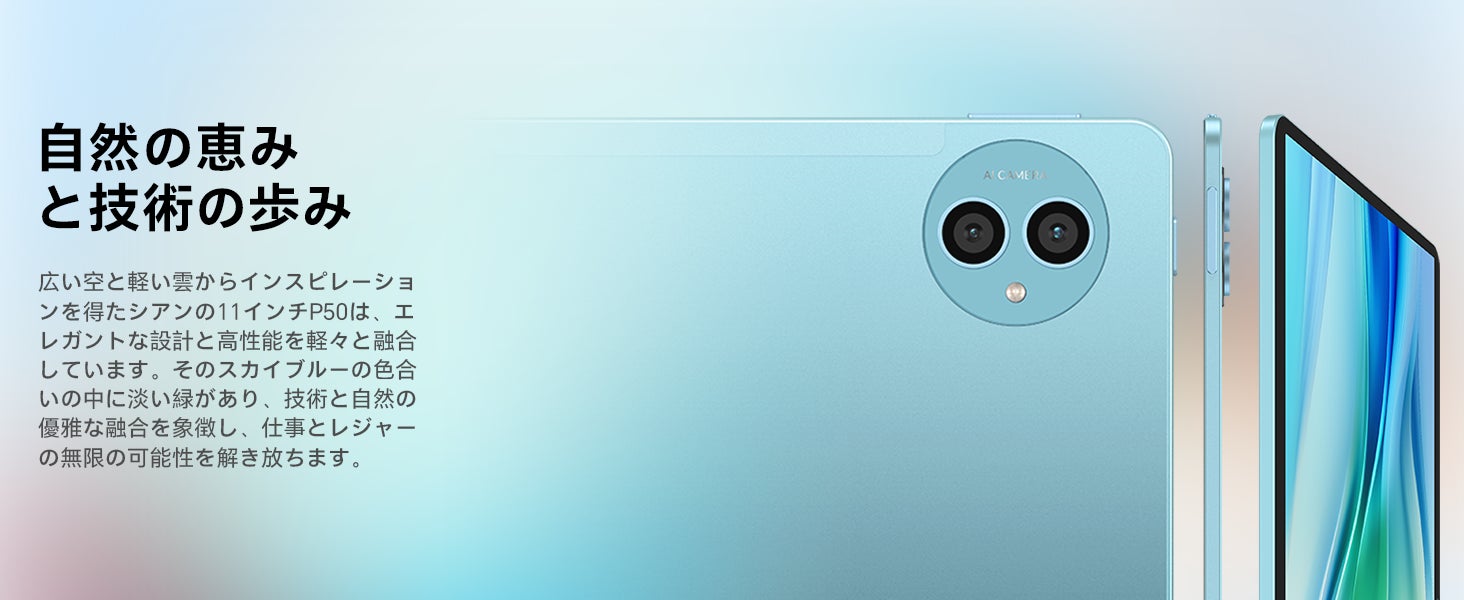 広い空と軽い雲からインスピレーションを得たシアンの11インチP50は、エレガントな設計と高性能を軽々と融合しています。そのスカイブルーの色合いの中に淡い绿があり、技術と自然の優雅な融合を象徴し、仕事とレジャーの無限の可能性を解き放ちます。