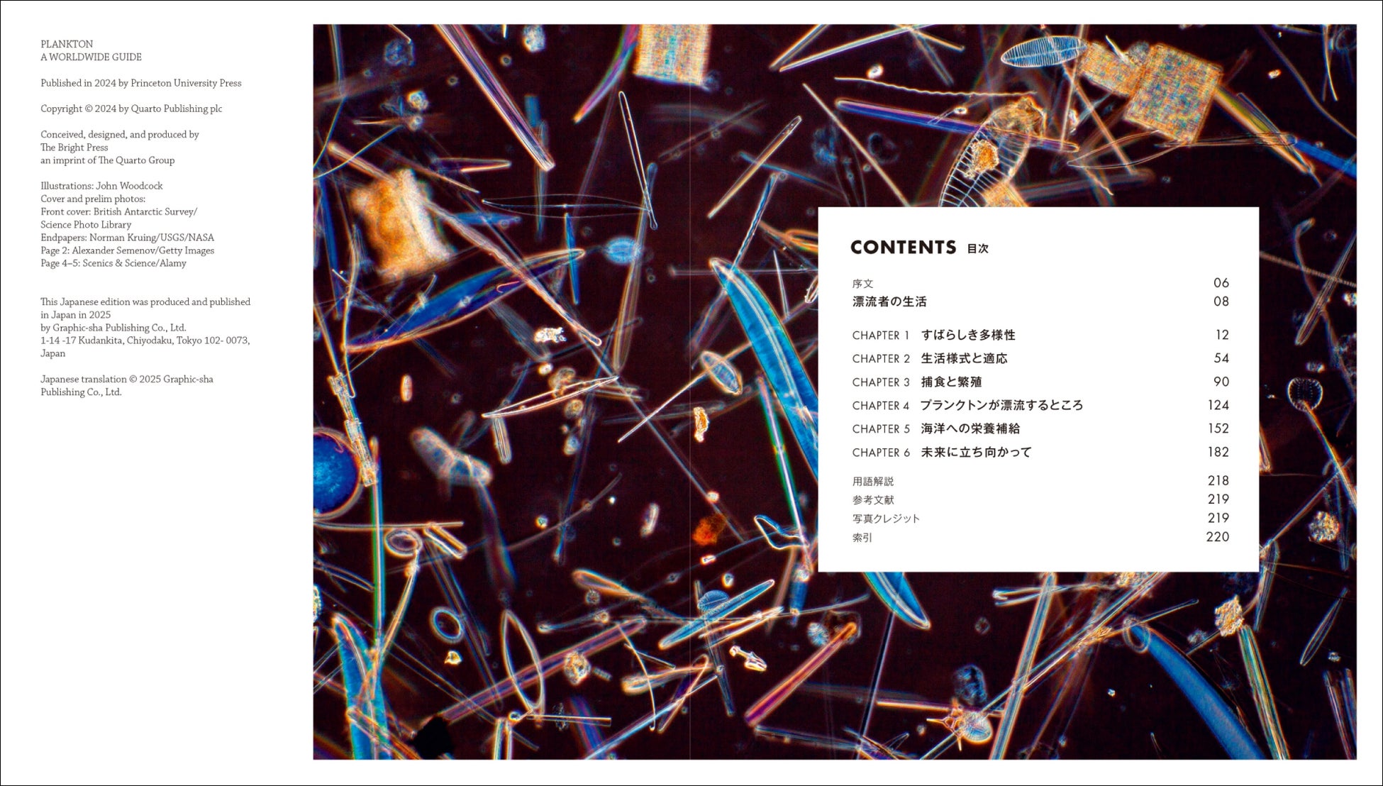 プランクトンの分類は多様で、魚類の幼生、クラゲの幼生、甲殻類の幼生、藻類、細菌などいろいろ。そのミクロの世界に焦点を当て、その多彩な生態に迫る美しいビジュアルブックです。