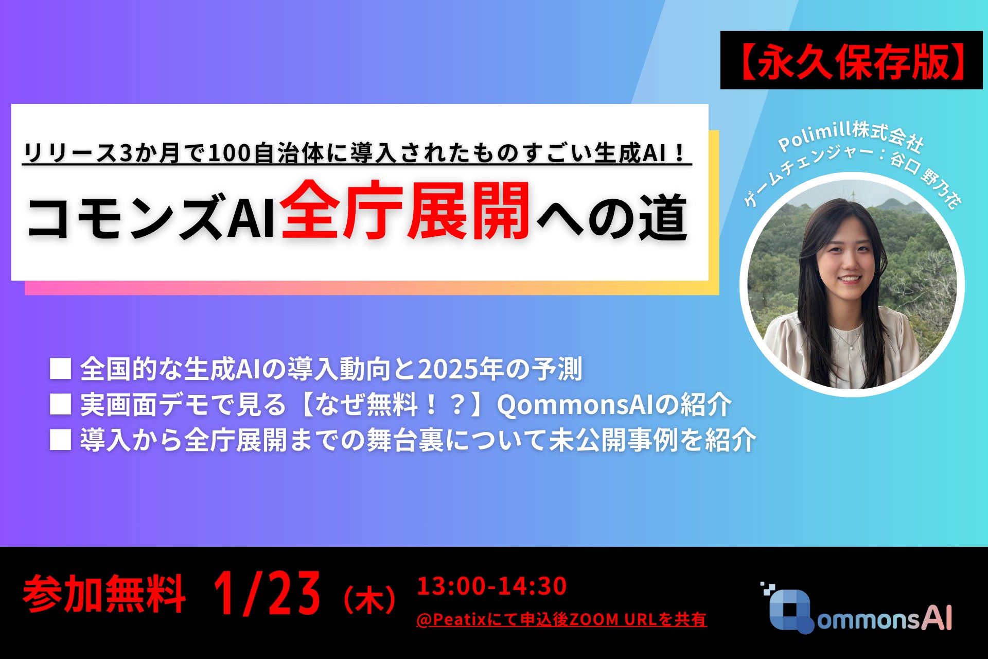 【自治体職員必見】2025年1月23日(木)無料オンラインセミナー開催決定!Polimillの生成AI「QommonsAI」導入から全庁展開までの舞台裏を一挙公開!
