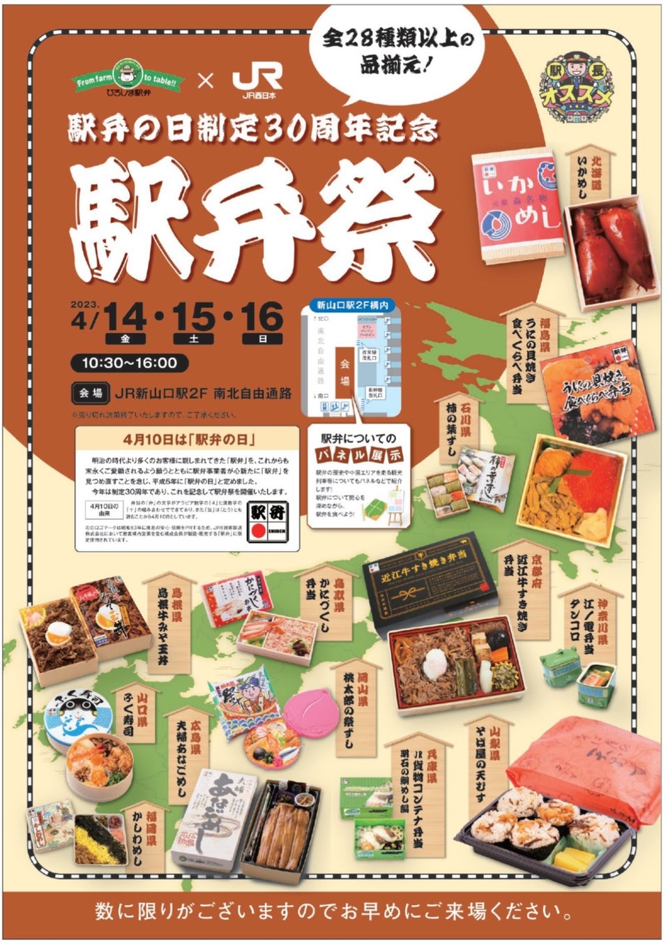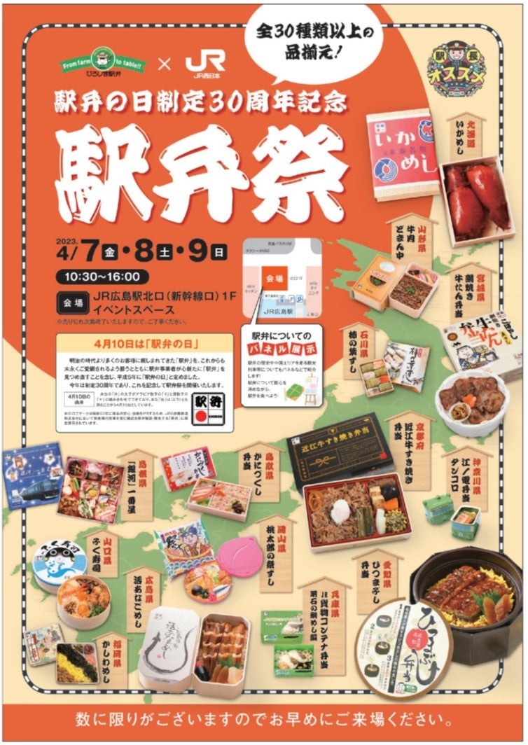 西日本旅客鉄道株式会社中国統括本部(広島市東区上大須賀町15-20、執行役員中国統括本部長:藏原 潮)広島駅弁当株式会社(本社:広島県広島市東区矢賀5-1-2、代表取締役社長:中島 和雄)は、4月10日に駅弁の日制定30年を迎えることから、広島駅(広島県広島市南区松原町2-37)と新山口駅(山口県山口市小郡令和1-2-1)において、駅弁祭を開催します。