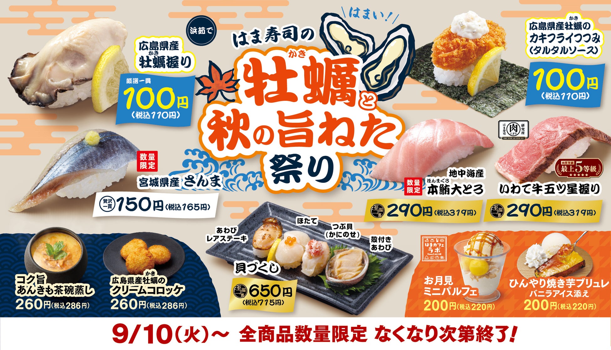 株式会社はま寿司(代表取締役社長:町野 岳 本社:東京都港区)が展開する100円寿司チェーン「はま寿司」は、9月10日(火)から「はま寿司の牡蠣(かき)と秋の旨ねた祭り」を全国の店舗で開催します。