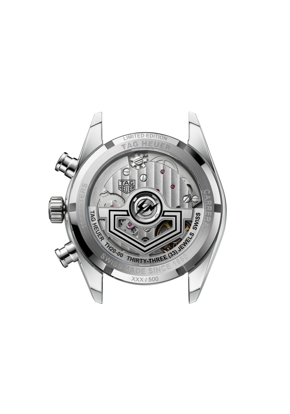 ムーブメントには、約80時間という驚異的なパワーリザーブを実現し、5年間の延長保証も適用される自社製ムーブメントTH20-00を採用。そして、フラグメント仕様に仕上げられたムーブメントデザインも、このタイムピースを際立たせる重要な要素です。タグ・ホイヤー シールドを象ったローターには、ブラックのグラフィック装飾が施され、藤原ヒロシのビジュアル言語でタグ・ホイヤーのエンブレムを再解釈。フラグメントのロゴもサファイアクリスタルに直接プリントされ、コラボならではのデザインタッチが加えられています。性能にこだわり、エンジニアリングを駆使したムーブメント構造は、コラムホイールと垂直クラッチを採用することで、クロノグラフの滑らかな動作を実現し、双方向自動巻き上げ機構により、効率的なエネルギーの流れを約束しています。