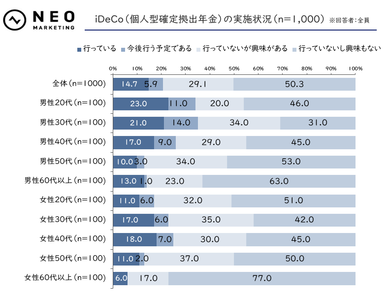 全体の結果を見ると、利用率は新NISAで30.5%、iDeCoで14.7%に。