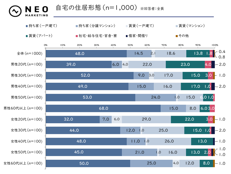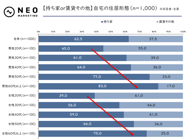 性年代別で結果を比較すると、男女ともに、年代が上がるほど持ち家率も上がっていく傾向が見られます。また、持ち家の内訳を見ると、分譲マンションよりも一戸建てが主流であることがわかります。