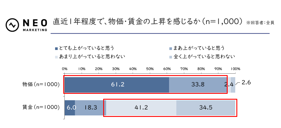 はじめに、直近1年程度の物価と賃金について、上昇していると感じるかお聞きしました。