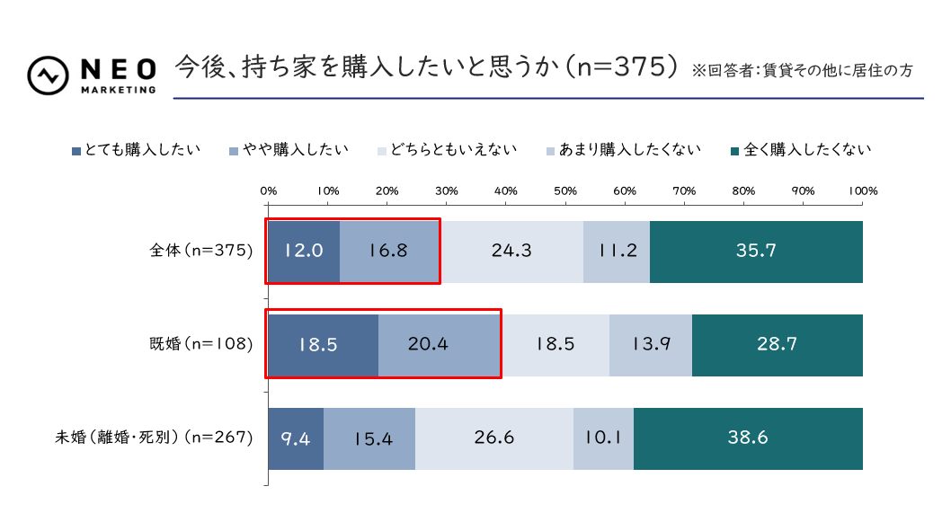 現在賃貸などに住んでいる層でも、全体の28.8%は、持ち家の購入に前向きな姿勢を見せていました。(「とても購入したい」「やや購入したい」の合算)