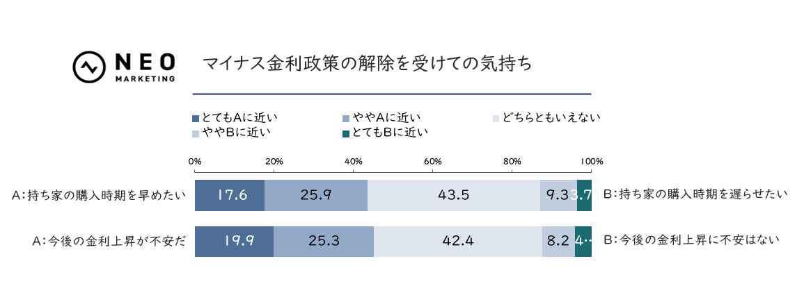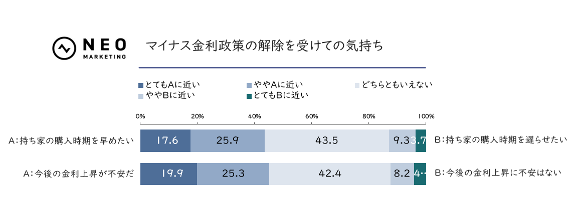 日銀のマイナス金利政策の解除を受け、持ち家購入希望者は購入時期を「早めたい」と考える割合が優勢に。また、今後の金利上昇に対しては、全体でも「不安だ」と感じる割合が優勢となりました。(「とてもAに近い」「ややAに近い」の合算)