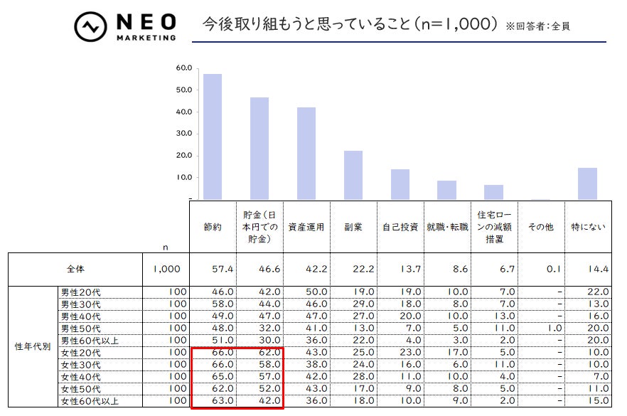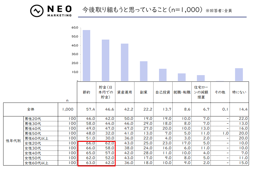 全体の結果を見ると、「節約」が57.4%でトップとなり、そこに「貯金(日本円での貯金)」が46.6%で続いています。