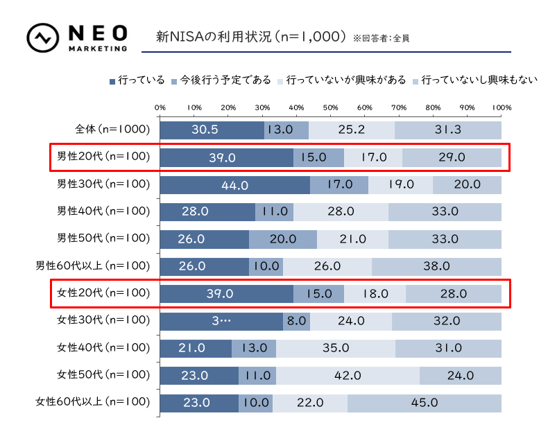 そんな中、男女差がほとんど見られなかったのが、20代における新NISAの利用状況。