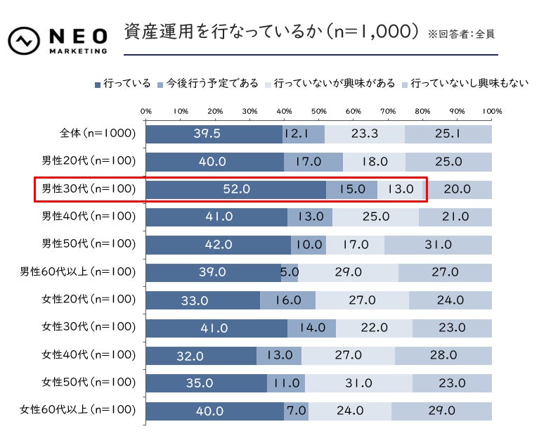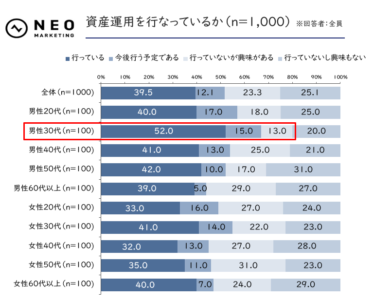 資産運用を行なっているか:資産運用実施率は39.5%。さらに、30代男性は80%以上が資産運用に前向きな姿勢。