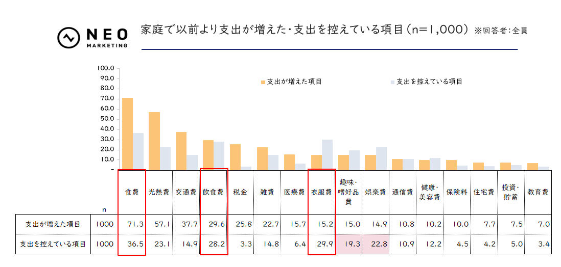支出が増えた項目としては「食費」が71.3%で圧倒的なトップとなり、そこに「光熱費」「交通費」が続いた。一方、支出を控えている項目としては、「食費」の次に「衣服費」「飲食費」が続いた。