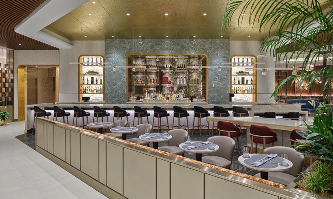 ラウンジの色調は、ロサンゼルスの自然と人工美の両方からインスピレーションを得たもので、南カリフォルニアの風景を想起させます。アイコン・バーは、夕暮れの色彩をレザーとウォールナットのアクセントで引き立て、背面の壁はヴェルデ・エメラルドの珪岩とオニキスを用いて海岸の空気感を表しています。