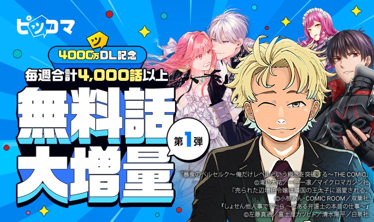 6/8(木)から6/28(水)までピッコマアプリ・ピッコマWEBの両方が対象の本イベントは、毎週木曜日、3週間に渡り国内タイトルの無料話が4,000話以上追加される大型イベントです。6/8(木)の第1弾では、年内のテレビアニメ放送が決まっている『暴食のベルセルク~俺だけレベルという概念を突破する~ THE COMIC』(マイクロマガジン社)や、『しょせん他人事ですから ~とある弁護士の本音の仕事~』(白泉社)、累計発行部数1,500万部突破の大人気作品『終末のワルキューレ』(コアミックス)などの無料話が6/8(木)〜6/14(水)の期間、増量されます。
