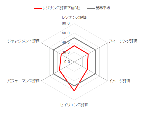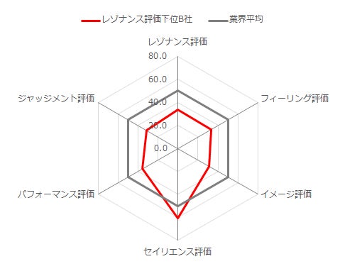 また、レゾナンス評価が下位のB社においては、「セイリエンス評価」は高く認知度は獲得できている一方、契約者における評価は全般的に低く、特に品質や信頼性などの包括的な評価を表す「ジャッジメント評価」や「イメージ評価」が全体の平均を大きく下回りました。このことからB社においてはブランド価値向上に向けて、「ジャッジメント評価」や「イメージ評価」を高める取り組みが重要となります。