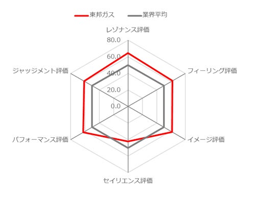 ブランドレゾナンスピラミッドの頂点にあたるロイヤルティが高い状態を表す「レゾナンス評価」について、愛着や共感、推奨度などの6つの質問項目から算出したところ、最も評価が高いのは東邦ガスとなりました。