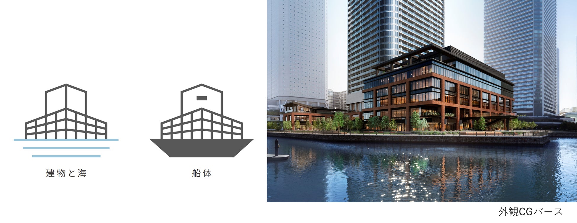 ロゴタイプは、横浜開港の歴史を感じさせるクラシックな書体をベースに、船が海を進む時に生まれる航跡波をイメージしたアクセントを組み合わせ、横浜の未来へと船が進む姿を表現しています。ロゴマークは、海側から見た建物を前進する「船」に見立て、本事業が歴史ある地で新しい横浜を切り拓いていくイメージを表現しています。