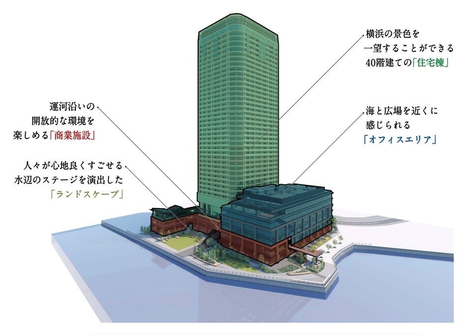 本事業は、みなとみらい線「馬車道」駅より徒歩約2分に位置し、二方が海に囲まれるウォーターフロントと呼ぶにふさわしい立地に誕生する大型複合開発事業となります。敷地内には運河沿いにプロムナードや約3,200㎡からなる広場を設けるほか、建物1階から2階に位置する低層部商業ゾーンは、運河沿いの開放的な環境と上質な時間を楽しめる約4,300㎡規模の飲食店舗、サービス店舗などが開業予定です。2階から6階に位置する、基準階面積 約740坪の大フロアを有するオフィスゾーンは横浜の海と広場を近くに感じられる眺望の中、利用者の健康性、快適性の維持・増進を支援する建物としてCASBEEスマートウェルネスオフィス認証を取得予定です。40階建ての住宅棟は横浜の景色を一望することができ、更に曲線美を描いたタワーは際立つフォルムにより横浜の新たなアイコンとなるデザインを目指しました。